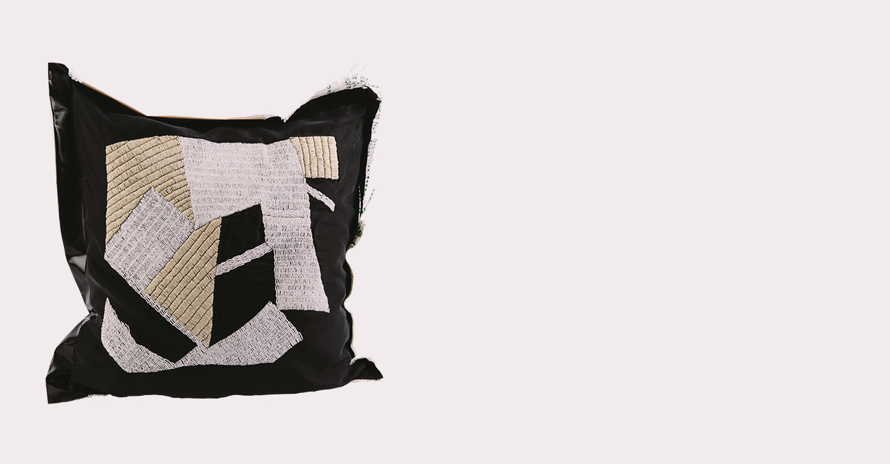 Microfiber pillow with white, nude and black cotton twine embroidery, silk top stitching and plastic bag with duct tape inserts. 20X20"