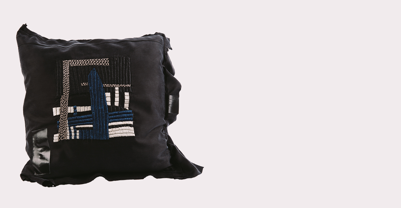 From the pillow series Square which uses unusual materials including plastic bags, silver mylar and fishing rod. Neil Gilks crafted these surprising materials into beautiful and naïve embroideries that make the pillows more art pieces than household items.
