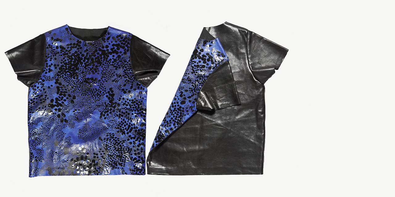 Acrylic and enamel paint on goat and pig leather t-shirt, 20" wide x 25" long. Black and blue color way.